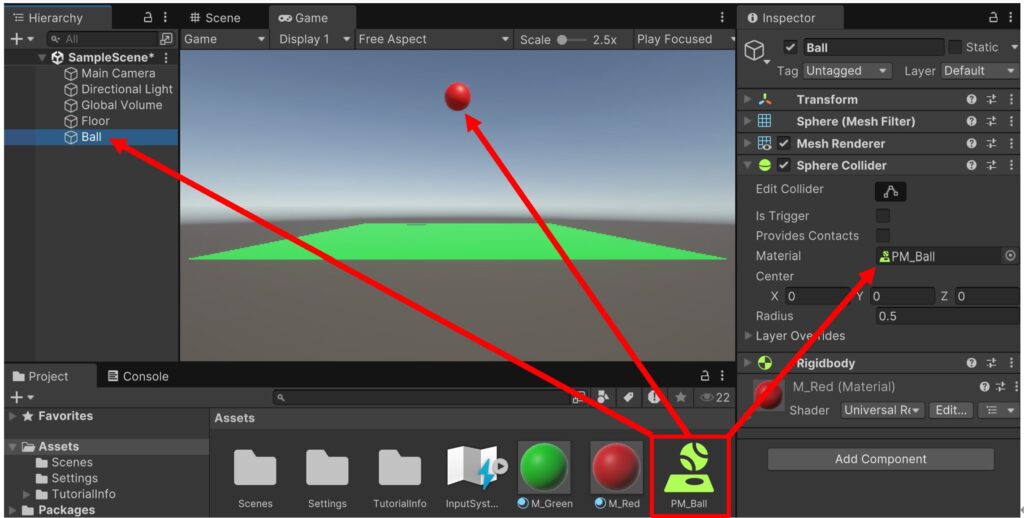※方法その3:「Inspector」ビューの「Sphere Collider」>「Materials」に「PM_Ball」をドラッグ&ドロップ