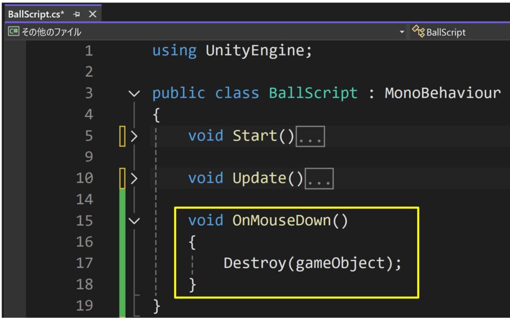 ・Visual Studio > 「BallScript.cs」に下図のようにコーディングします。