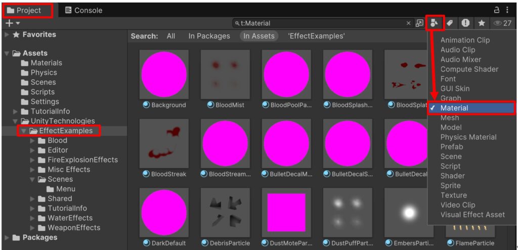 ○マテリアルにURP(ユニバーサルレンダーパイプライン )を適用する。 ・「Project」ビュー>「EffectExamples」を選択 ・「Project」ビュー右上の「Search by Type」(○□△が重なったアイコン)をクリック>「Material」を選択 ・マテリアルだけが表示された状態になる。