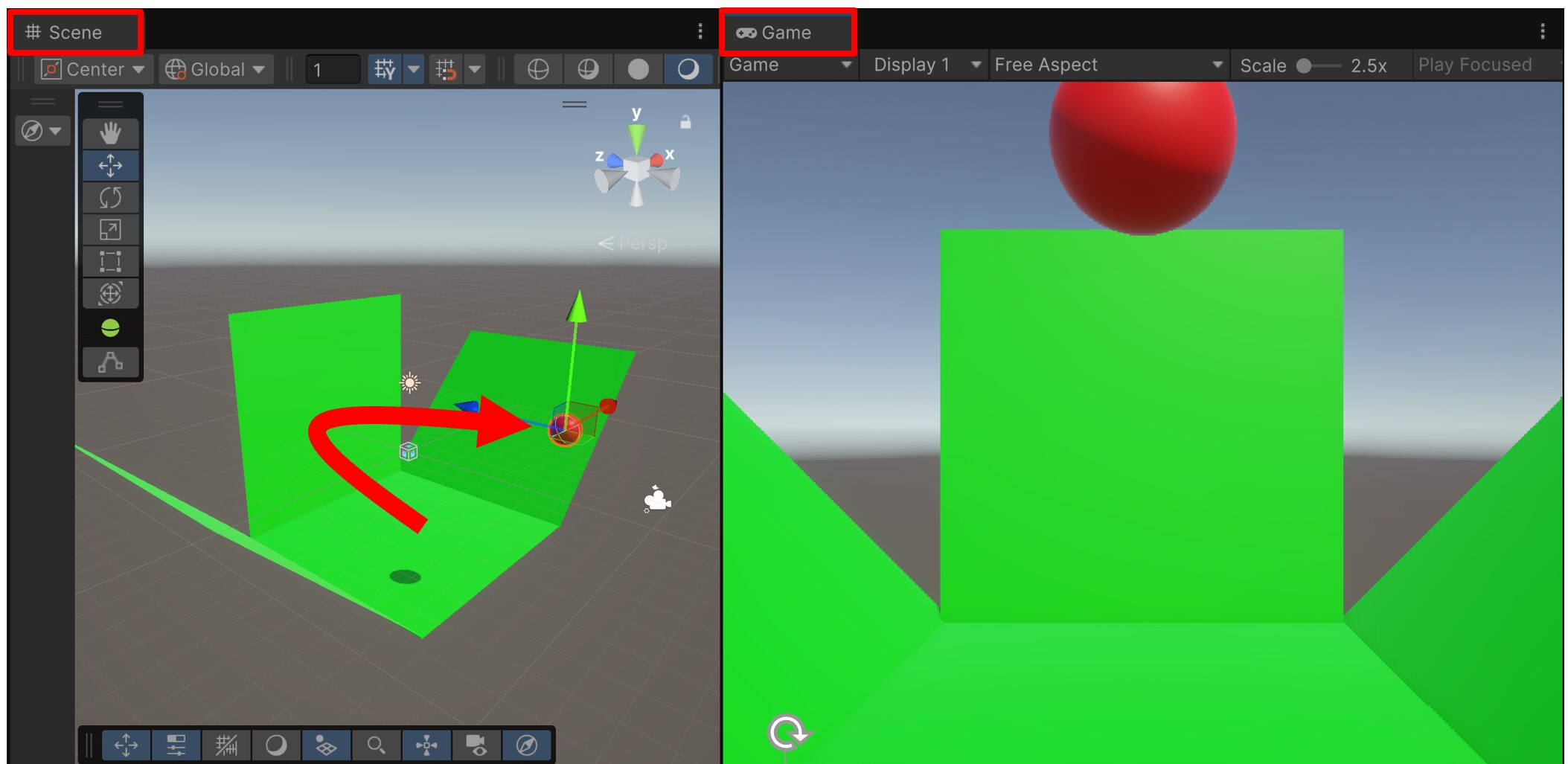 ※下図は、「Scene」ビューと「Game」ビューを並べた様子です。