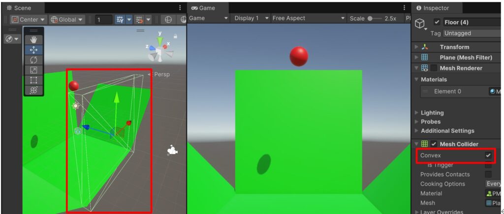 ・前方の壁を選択>「Inspector」ビュー>「Mesh Collider」>「Convex」にチェックを入れます。